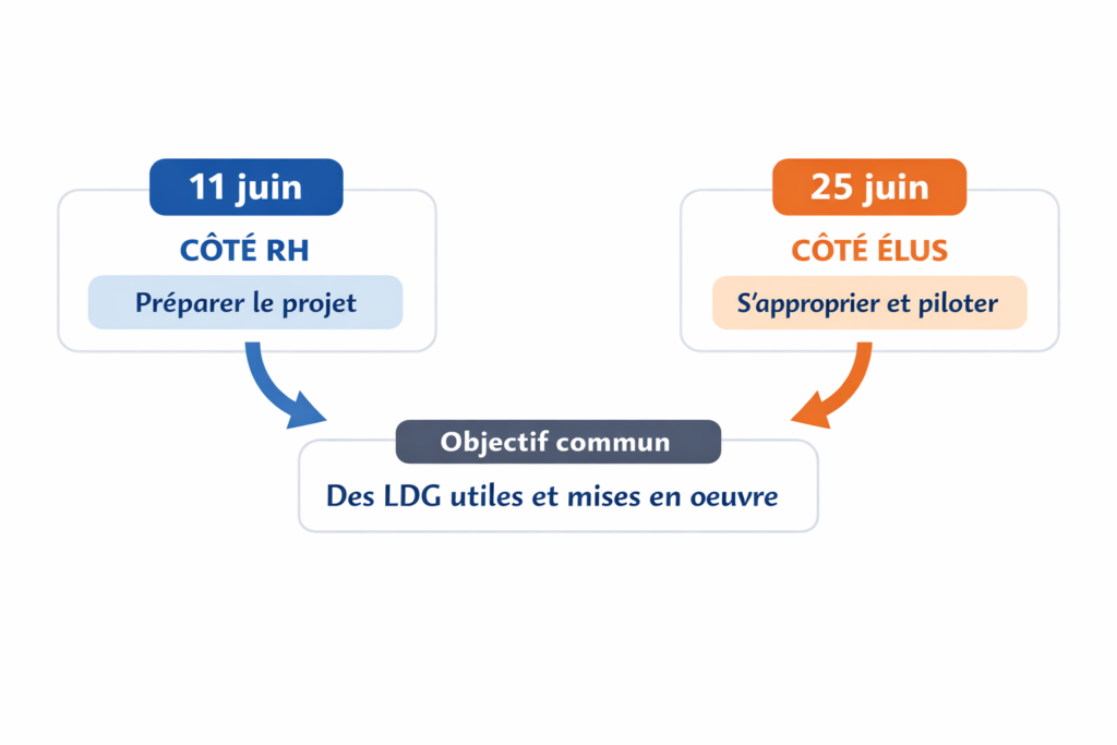Cet atelier est destiné aux élus, pour les accompagner dans la mise en place des LDG en début de mandat et les piloter dans la durée. Il permet de clarifier leur rôle et de donner un cadre à la politique RH de la collectivité.